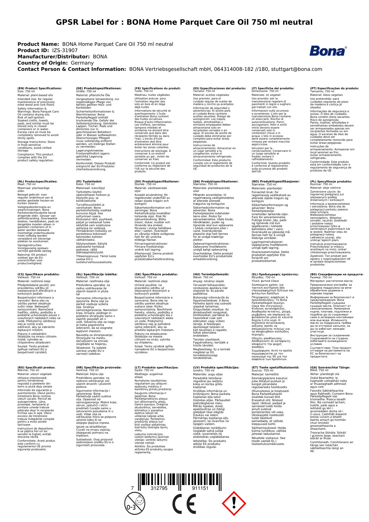 WARNUNG: Bona Parkettpflegeöl enthält trocknende Öle. Gefahr der Selbstentzündung. Getränkte Lappen, Tücher, Pads und ähnliches nur in geschlossenen Behältern oder in Wasser aufbewahren.