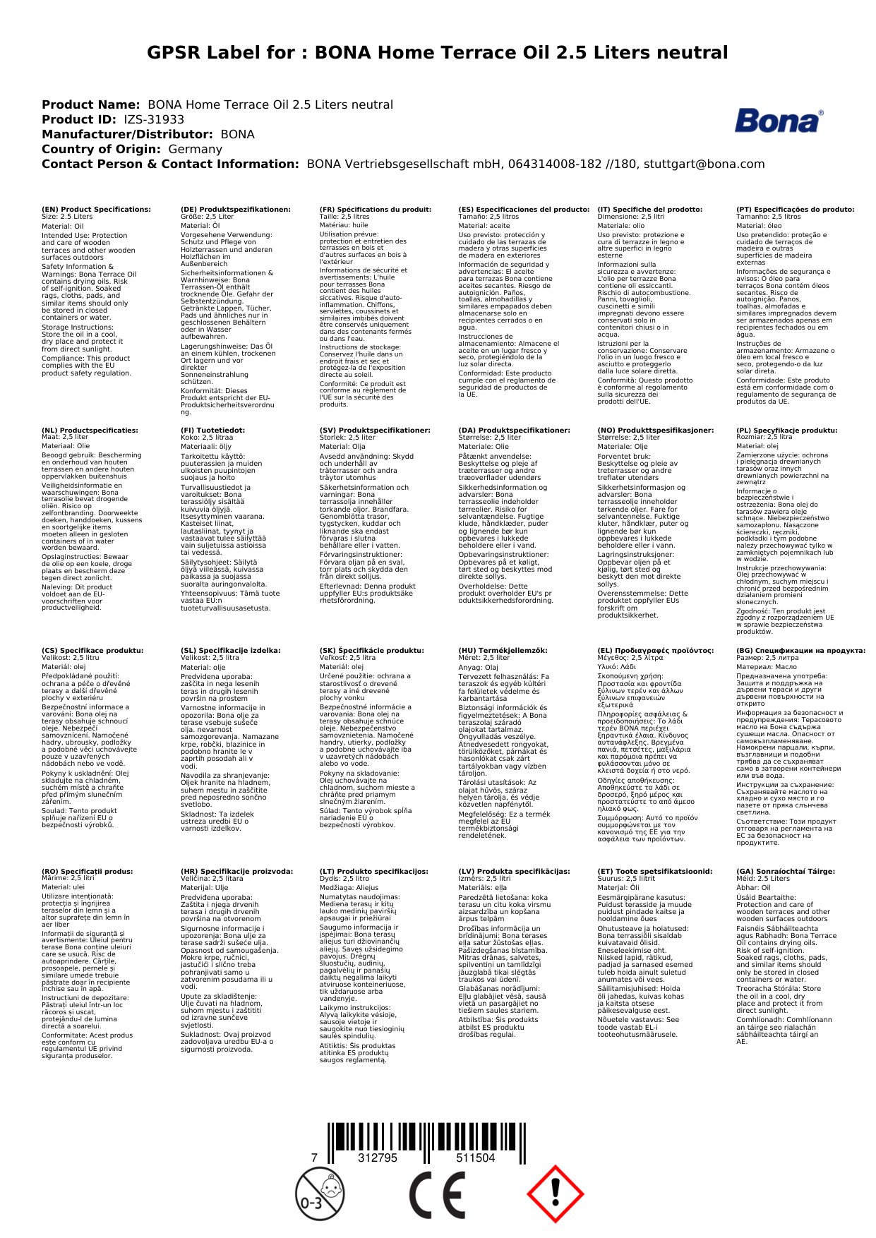 WARNUNG: Bona Terrassen-Öl enthält trocknende Öle. Gefahr der Selbstentzündung. Getränkte Lappen, Tücher, Pads und ähnliches nur in geschlossenen Behältern oder in Wasser aufbewahren.