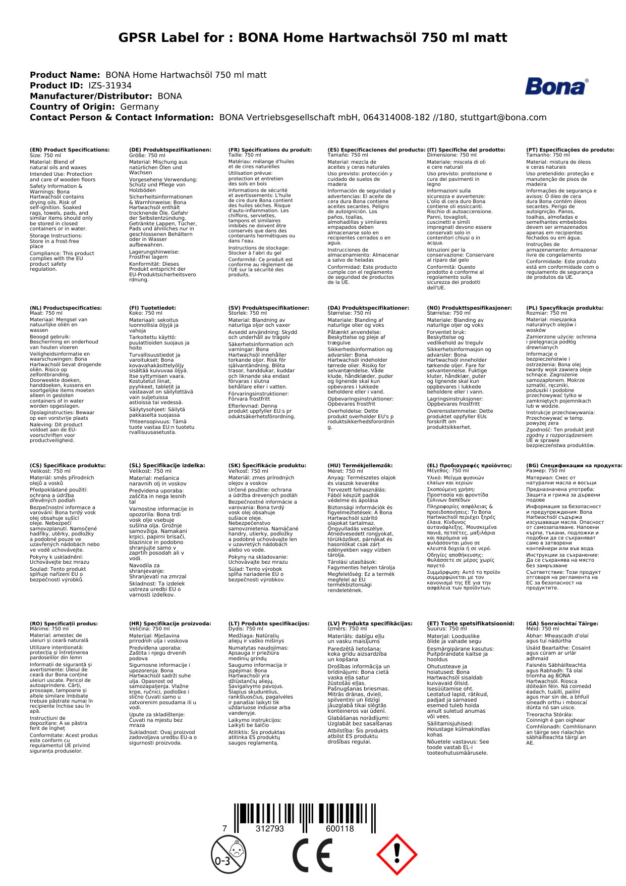 Bona Hartwachsöl enthält trocknende Öle. Gefahr der Selbstentzündung. Getränkte Lappen, Tücher, Pads und ähnli-ches nur in geschlossenen Behältern oder in Wasser aufbewahren.