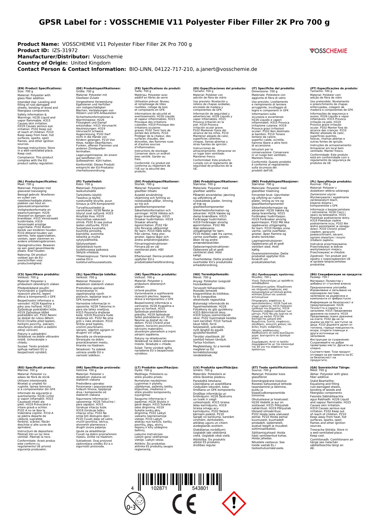 VOSSCHEMIE V11 Polyester Faserspachtel 2K Pro 700 g