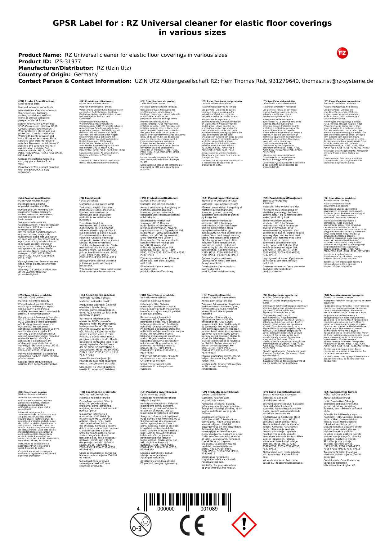 RZ Grundreiniger Universal zur Reinigung von elastischen Bodenbelägen, Linoleum, Kautschuk, Natur- und Kunststein. Entfernt stärkste Verschmutzungen, alte Pflegefilme und Aufschichtungen. Auch geeignet für lackversiegelte Parkett- und Korkböden.