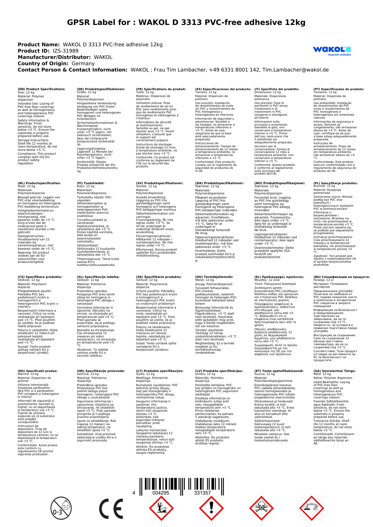 Dispersionsklebstoff für die Verlegung von PVC freien Bodenbelägen in Bahnen, Planken und Fliesen, homogenen und heterogenen PVC-Belägen in Bahnen und Fliesen, PVC-Designbelägen in Planken und Fliesen sowie CV-Belägen auf saugfähige Untergründe im Innenbereich. WAKOL D 3313 entspricht DIN EN ISO 22636.