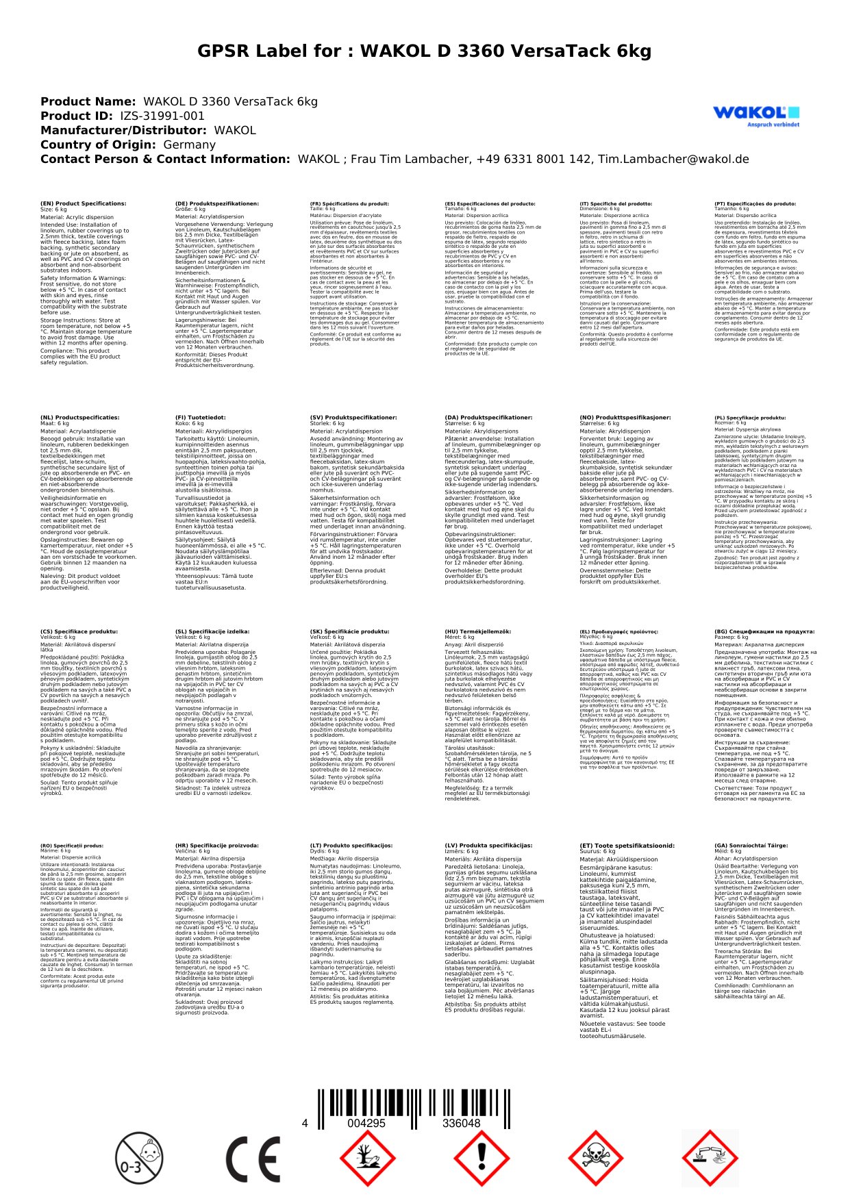 Dispersionsklebstoff für die Verlegung von Linoleum, Kautschukbelägen bis 2,5 mm Dicke, Textilbelägen mit Vliesrücken, Latex-Schaumrücken, synthetischem Zweitrücken oder Juterücken, gewebten Textilbelägen und Nadelvliesbelägen auf saugfähige sowie für PVC- und CV-Beläge auf saugfähige und nicht saugende Untergründe. WAKOL D 3360 entspricht DIN EN ISO 22636.
