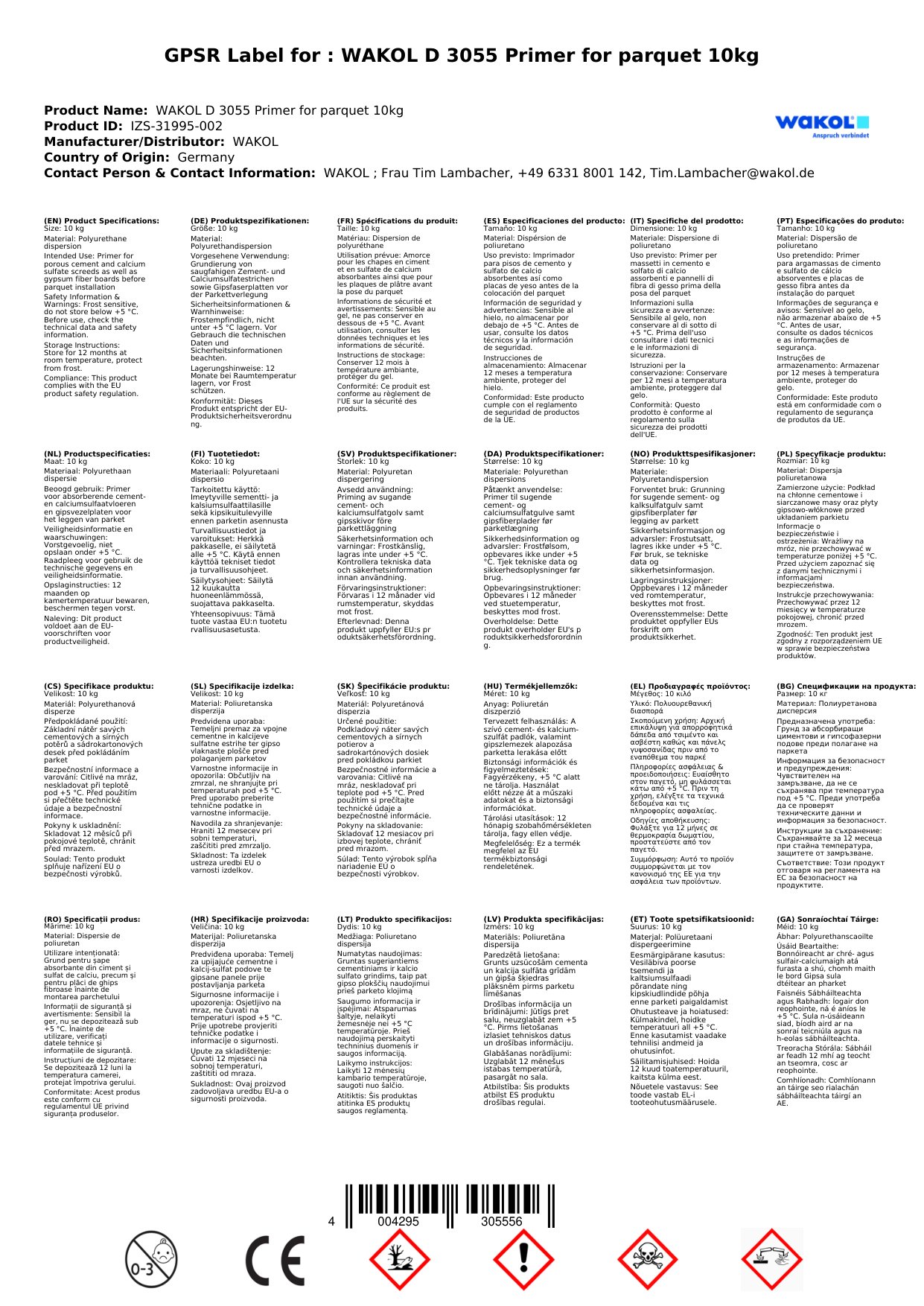 Gebrauchsfertiger Dispersionsvorstrich zum Grundieren von saugfähigen Zement- und Calciumsulfatestrichen sowie Gipsfaserplatten vor der anschließenden Parkettverlegung mit Wakol Parkettklebstoffen im Innenbereich.