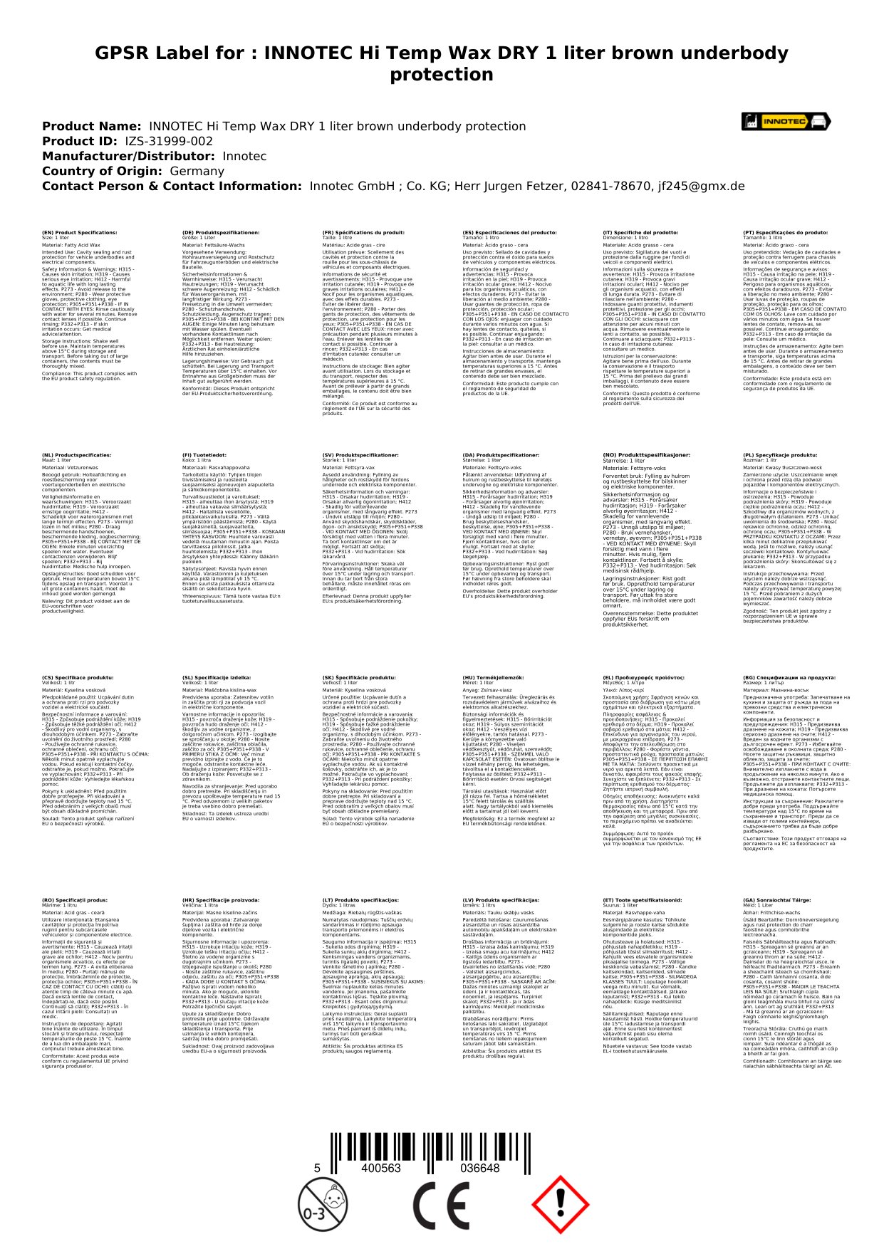 Innotec Hi Temp Wax DRY 1 Liter