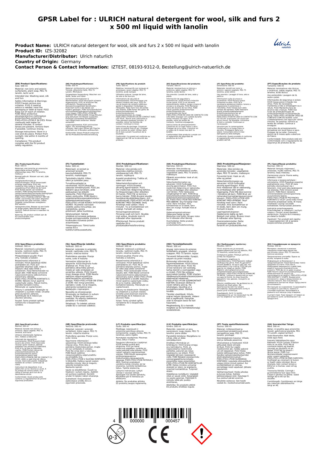 Stellen Sie eine Frage, um mehr über das Produkt zu erfahrenULRICH natürlich Waschmittel für Wolle, Seide und Felle 2 x 500 ml flüssig (mit Lanolin)