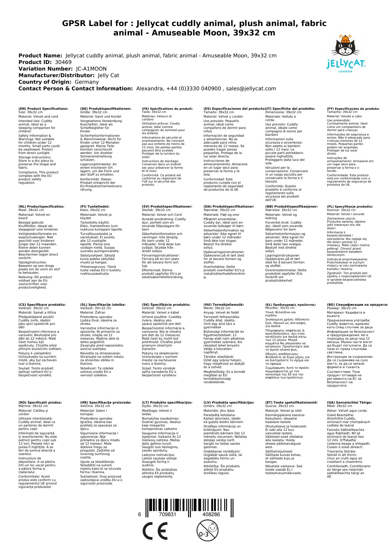 Das Stofftier ist aus hochwertigem Polyester hergestellt und entspricht den europäischen Sicherheitsnormen für Spielzeug (EN71 Teil 1, 2 und 3). Es ist für alle Altersgruppen geeignet, aber am besten schon ab der Geburt.