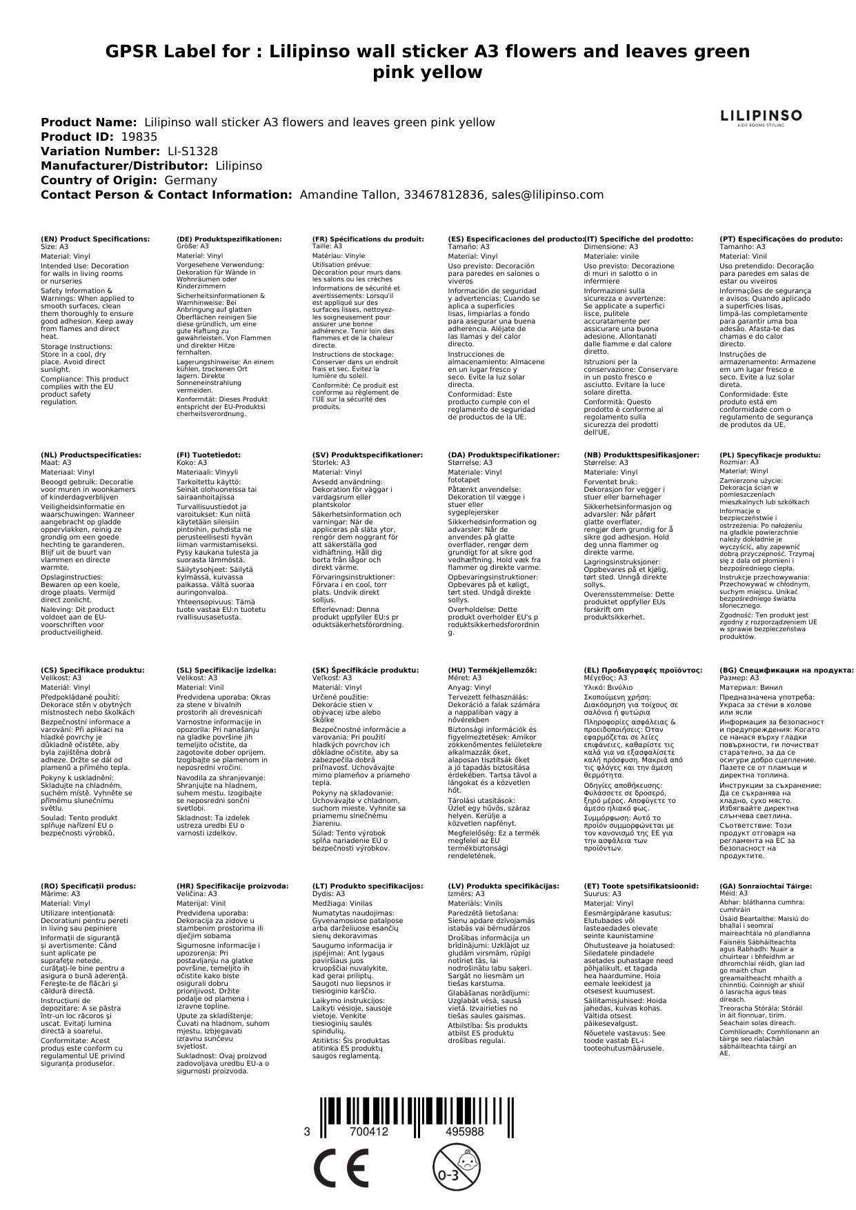 Die Sticker werden für Sie in Frankreich bei Lilipinso bestellt, wenn sie bei uns nicht vorrätig sind. Wir verpacken sie liebevoll für Sie und lassen Sie mittels einer Mail wissen, sobald das Paket unser Lager verlässt.