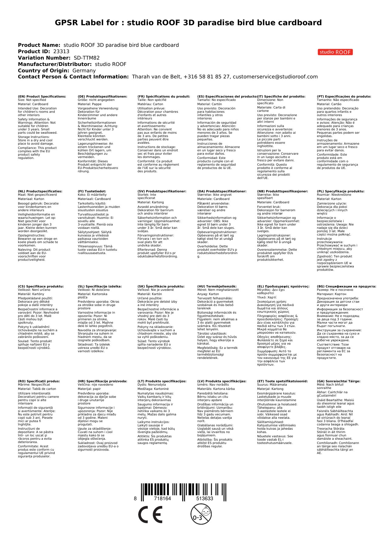 Das 3D Objekt kommt aus dem Hause studio ROOF. Das niederländische Label hat sich auf Dekoration und Spielzeug aus Pappe spezialisiert und besticht durch originelle und phantasievolle Figuren.