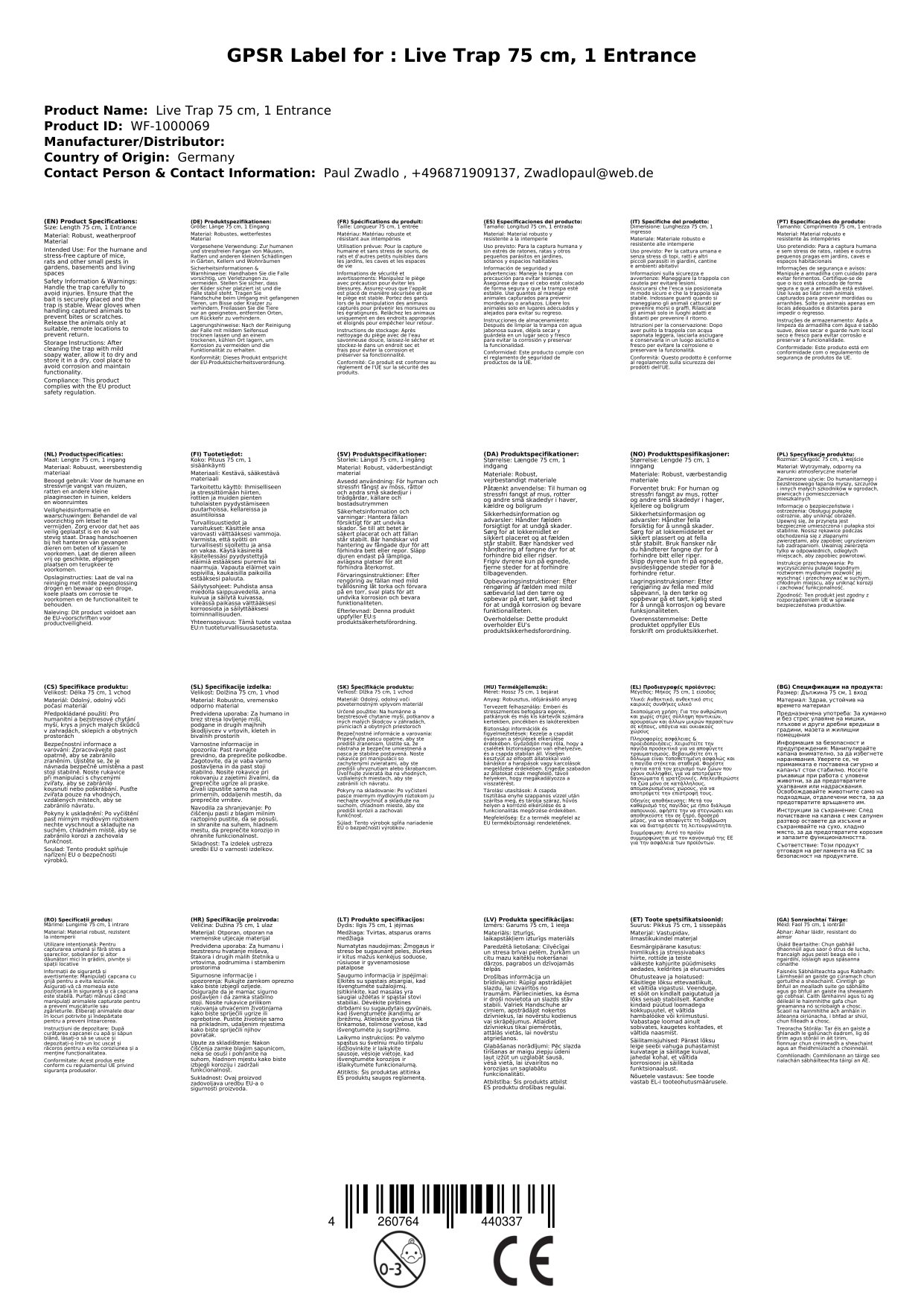 Lebendfalle 75 cm, 1 Eingang