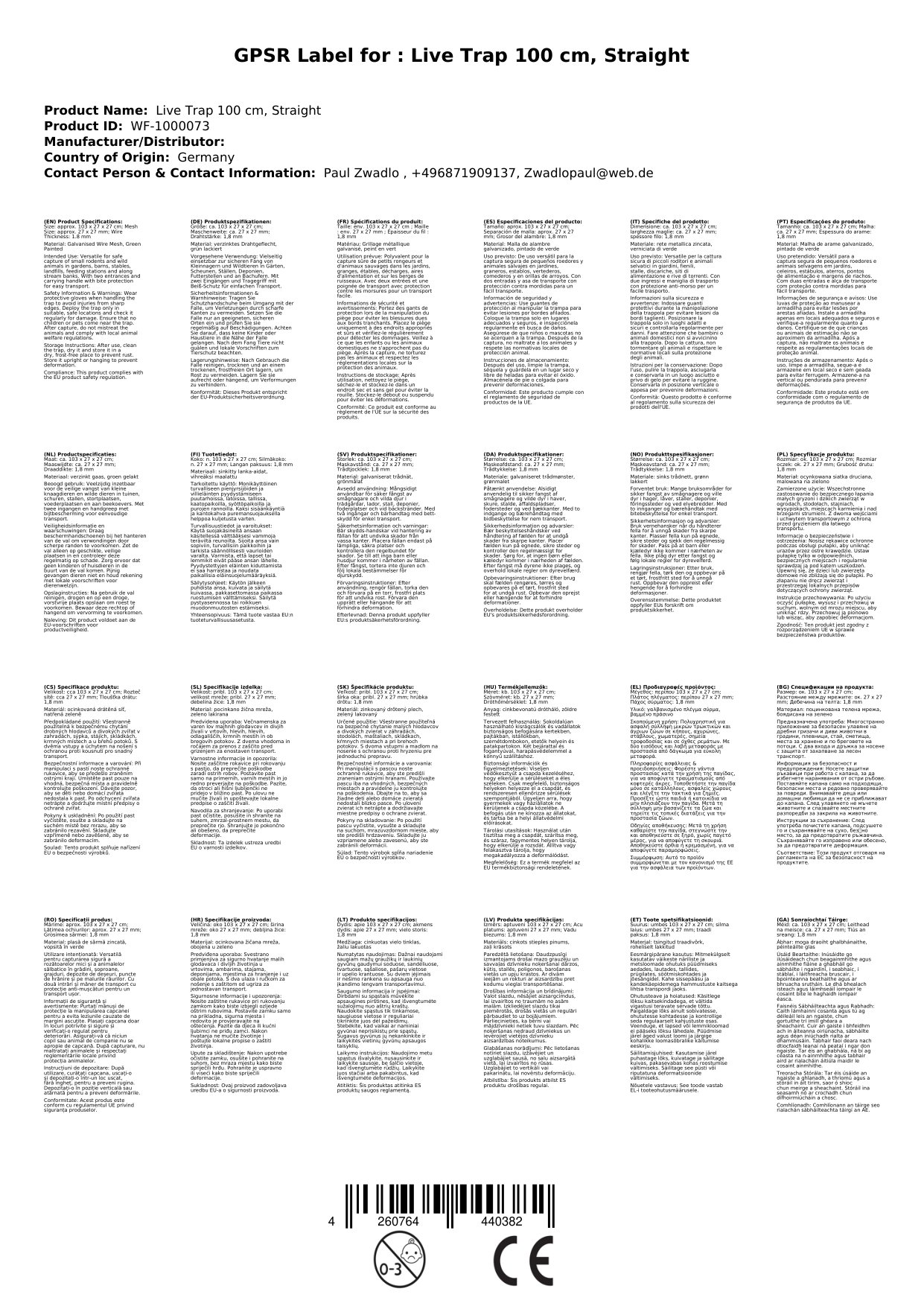 Lebendfalle 100 cm, gerade