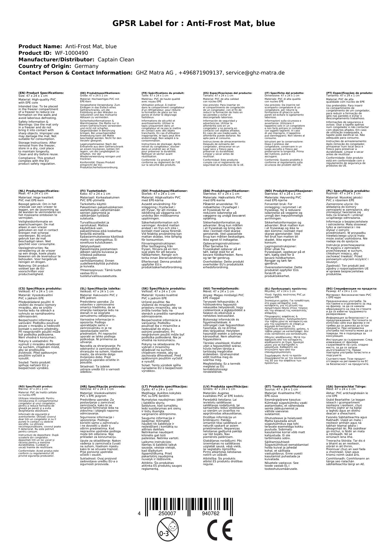 - 1 x Anti-Gefriermatte (blau, 47 x 24 x 1 cm)