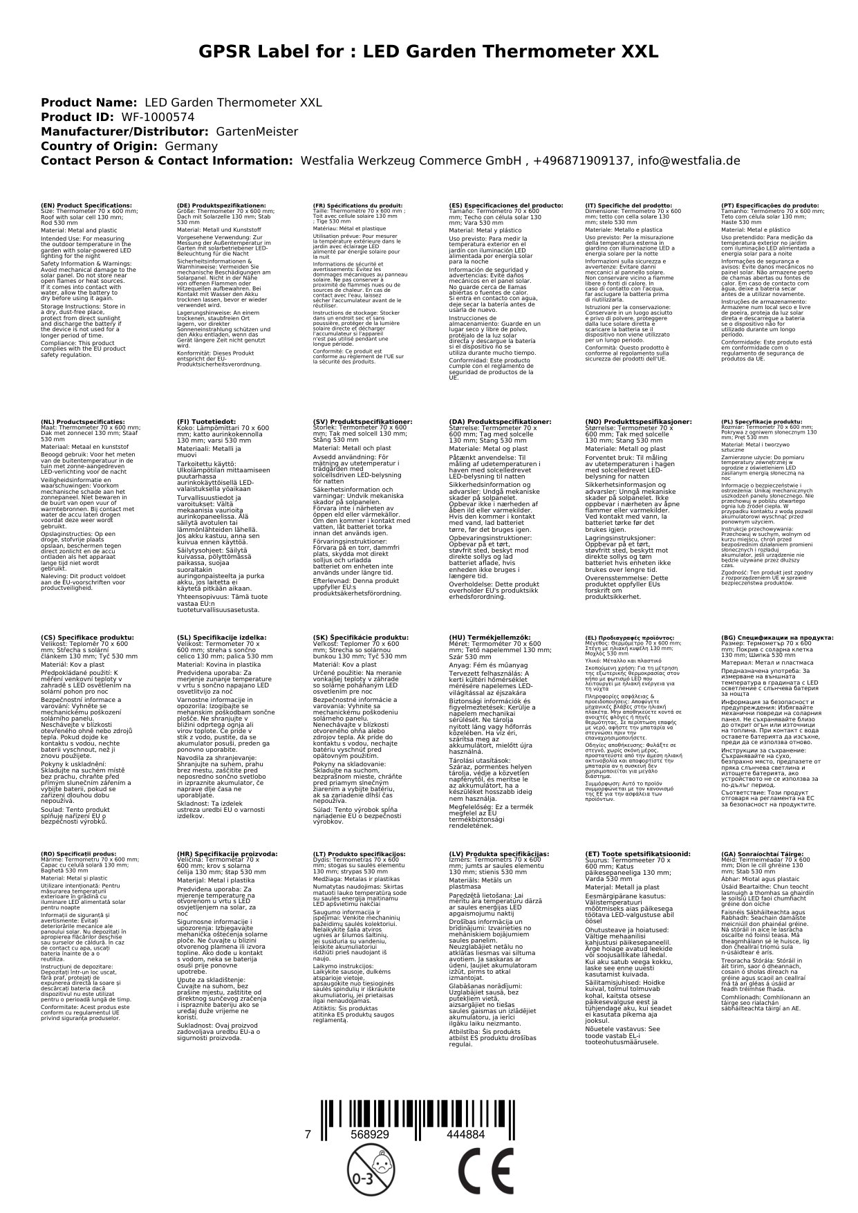 Stellen Sie eine Frage, um mehr über das Produkt zu erfahrenDas XXL LED Solar Garten-Thermometer ist eine praktische und dekorative Ergänzung für Ihren Garten. Durch die verwendeten Marteralien eignet es sich hervorragend für den Außenbereich.