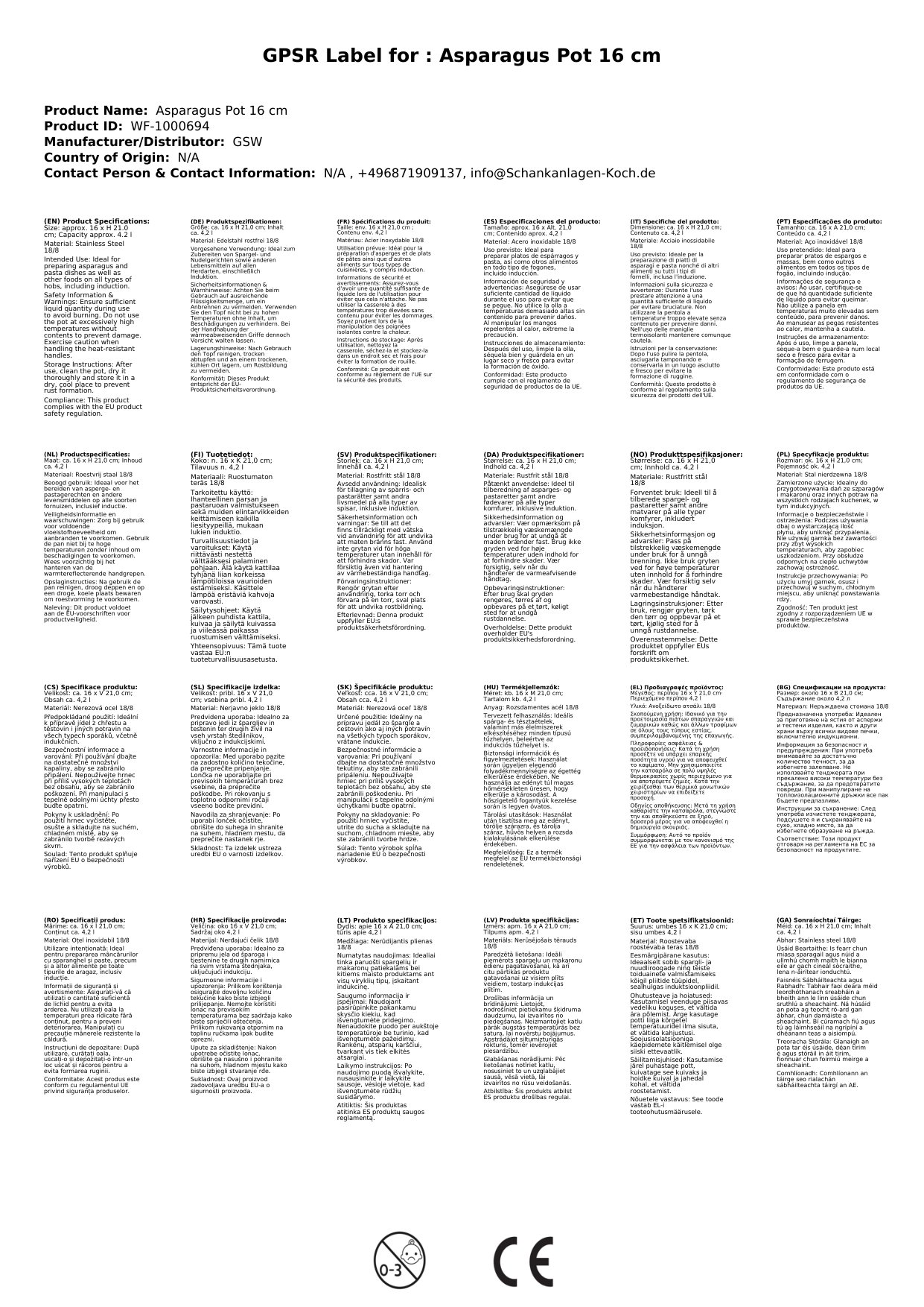 Durch den extra starken, energiesparenden Kapselboden ist der Topf für alle Herdarten - auch für Induktion geeignet. Mit diesem Spargel- und Spaghettitopf aus dem Hause GSW wird die Küche um formschöne und praktische Utensilien ergänzt. Alle Bestandteile sind spülmaschinengeeignet.