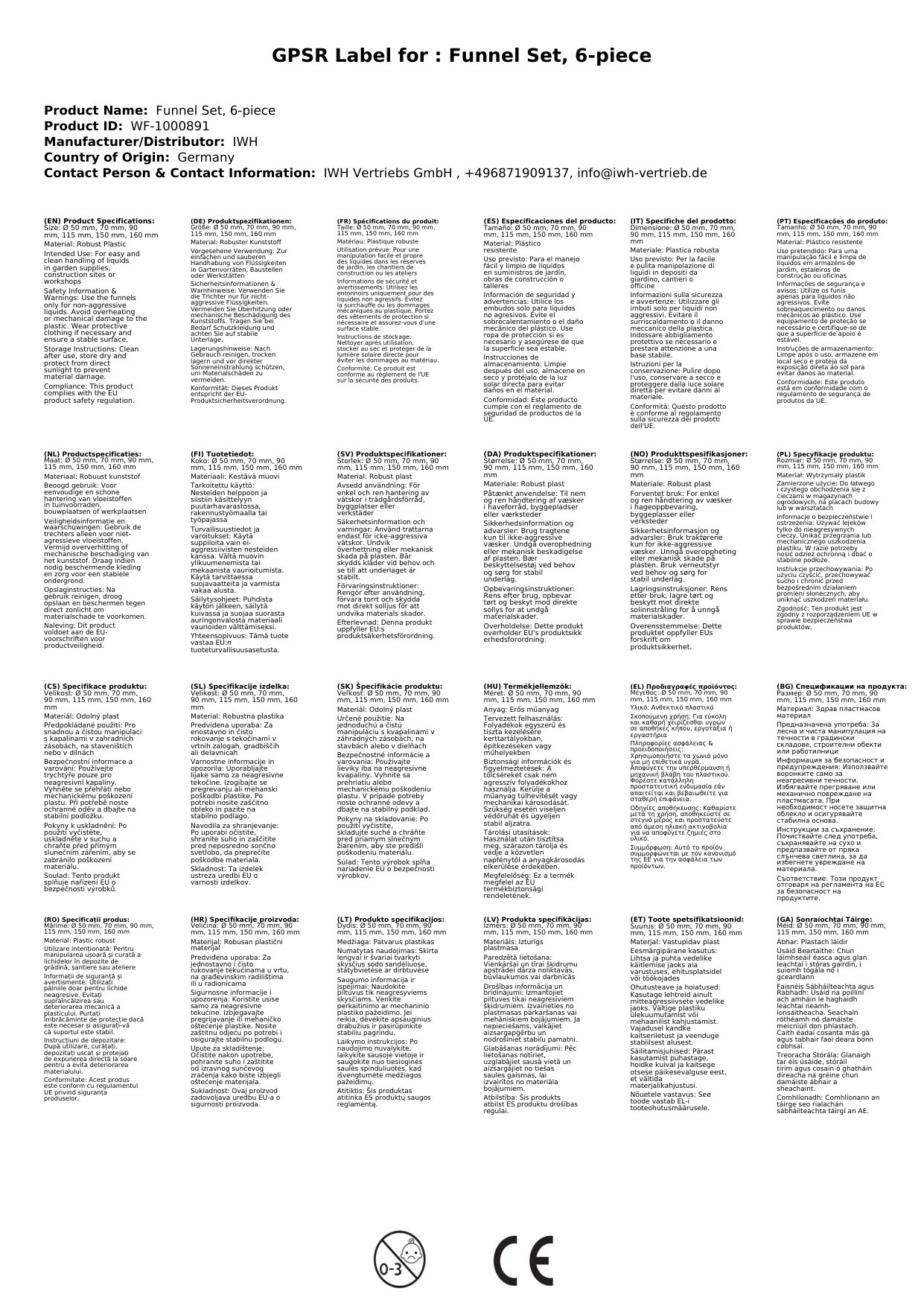 Stellen Sie eine Frage, um mehr über das Produkt zu erfahrenDieses 6-teilige Trichter-Set aus robustem Kunststoff bietet die ideale Lösung für verschiedene Anwendungen. Dank hoher Ränder, Entlüftungsstegen und stabilen Handgriffen ermöglichen die Trichter eine einfache und saubere Handhabung.