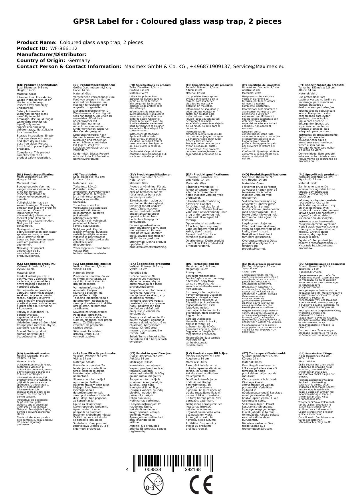 Wespenfalle aus Glas, farbig, 2 Stück