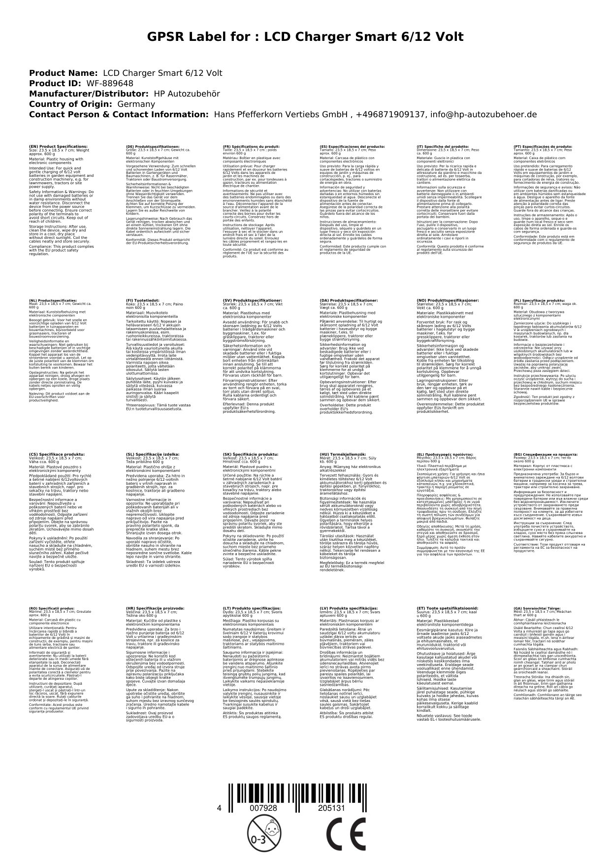 Stellen Sie eine Frage, um mehr über das Produkt zu erfahrenDieses mikroprozessorgesteuerte Ladegerät sorgt für eine schnelle und schonende Ladung von 6/12 Volt Batterien. Mit LCD-Display und 7-stufigem Ladevorgang ist es perfekt für eine zuverlässige Wartung Ihrer Batterien.