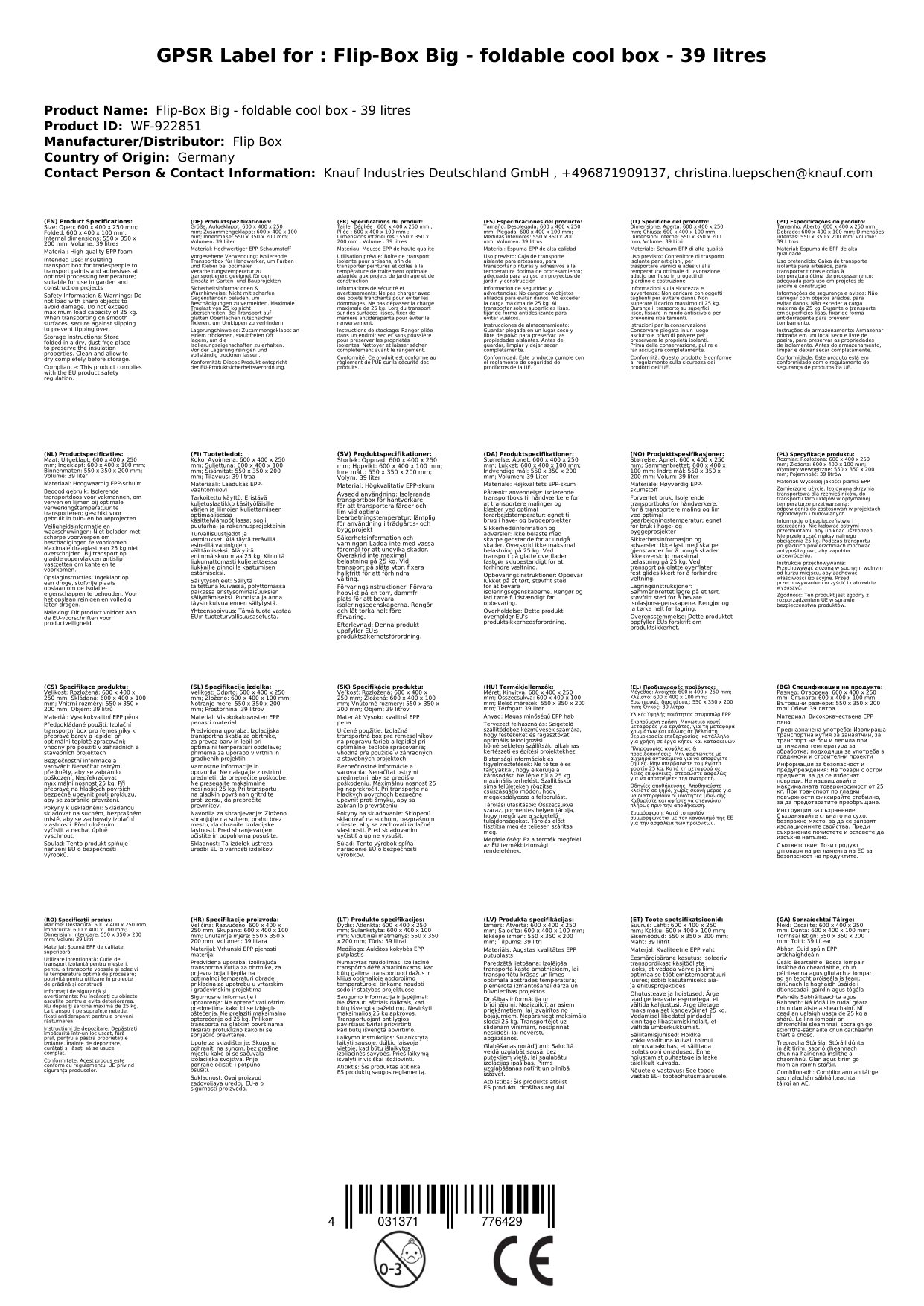 Abmessungen: aufgeklappt 600 x 400 x 250 mm, zusammengeklappt – 600 x 400 x 100 mm, Innen: 550 x 350 x 200 mm