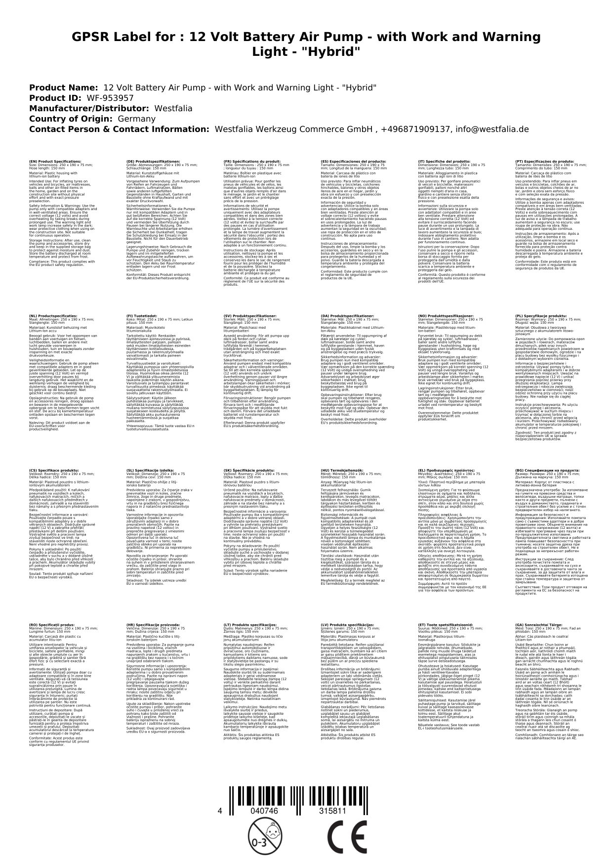 Der Betrieb der Druckluftpumpe von Westfalia ist über einen Akku, das mitgelieferte Netzteil oder den Zigarettenanzünder-Adapter möglich. Zur Erhöhung der Arbeitssicherheit bei Dunkelheit wurde eine Arbeits- und Warnleuchte in den Handschutz integriert. Diese erleichtert das Befüllen im Dunkeln.