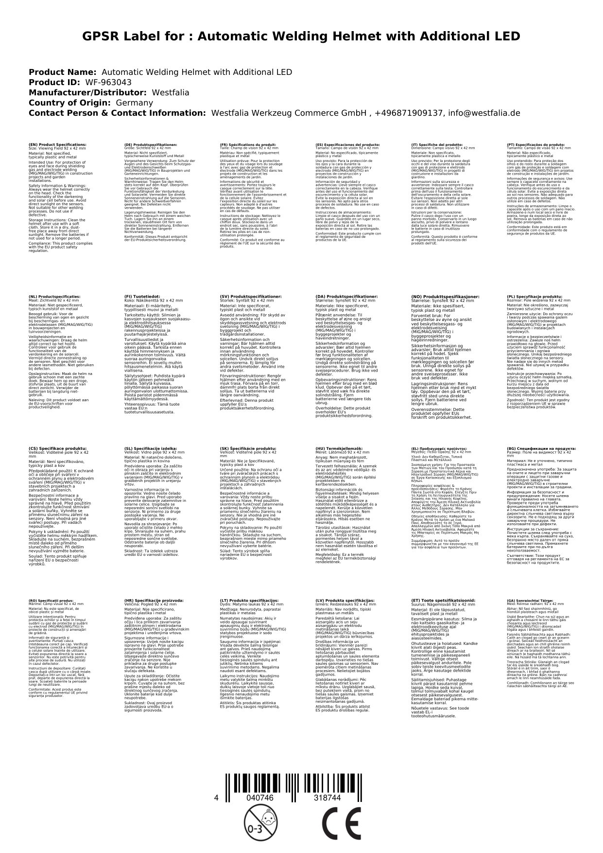 Stellen Sie eine Frage, um mehr über das Produkt zu erfahrenSchweißerhelm mit ergonomischem Kopfband. Verdunkelung erfolgt automatisch. Einstellbare Empfindlichkeit, sowie Aufhellzeit. Geeignet zum Schutzgas- und Elektrodenschweißen (MIG/MAG/WIG/TIG).