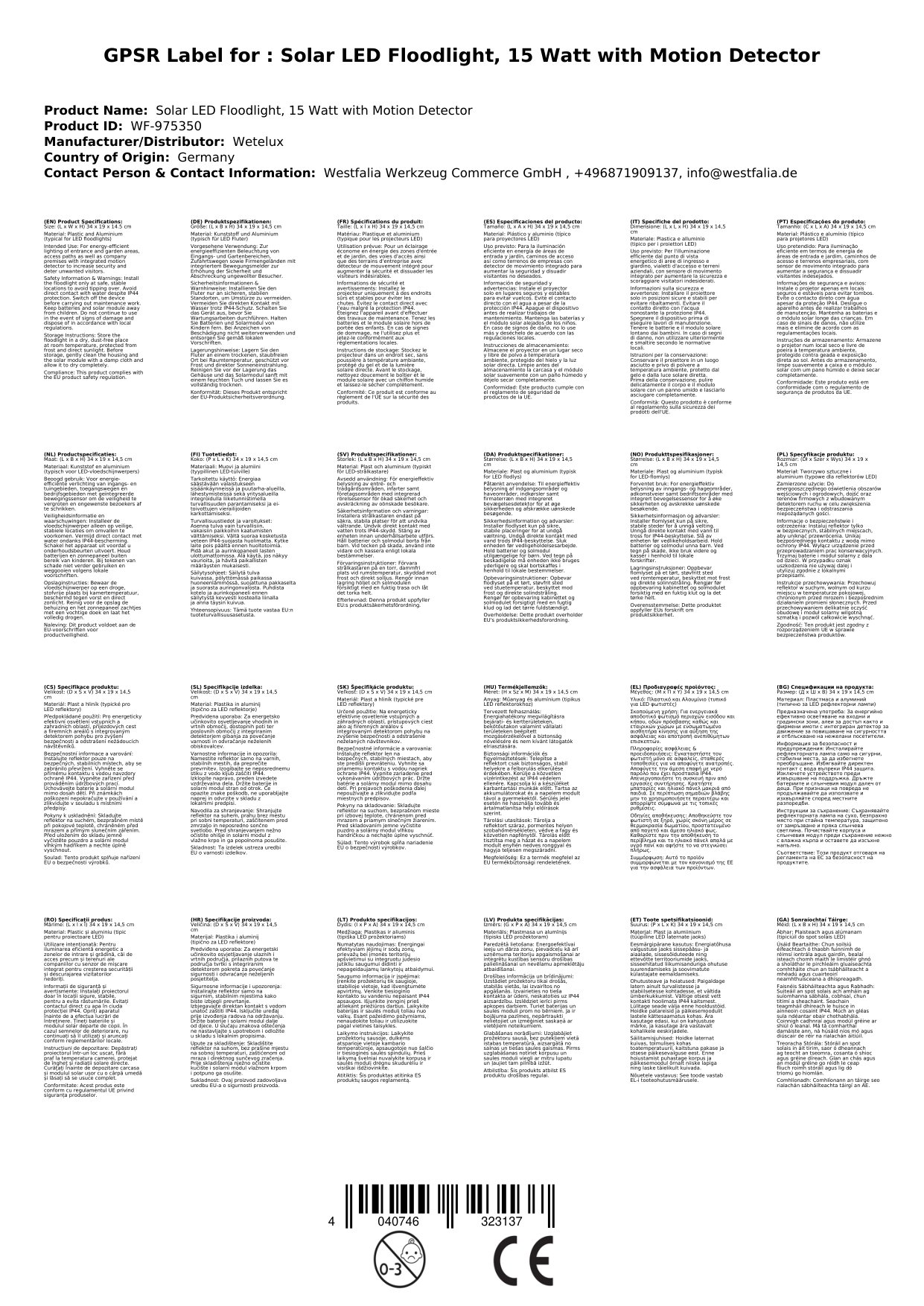 - 1 x Solar LED Fluter, 15 Watt mit Bewegungsmelder