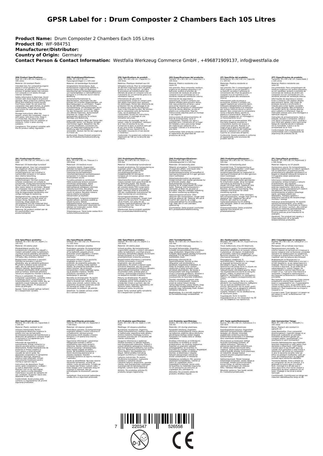 Lieferumfang: 1 x Trommel-Komposter 2 Kammern je 105 Liter